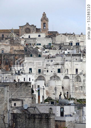 ドゥオーモの尖塔を見るマテーラ洞窟住居群風景