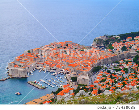 クロアチアの世界文化遺産、アドリア海の真珠ドブロブニク スルジ山から眺める城壁や旧市街と鮮やかな海