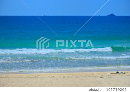伊豆半島・南伊豆・多々戸浜の白く美しい砂浜に寄せる波とサーフボードのイメージ・静岡県下田市(2)