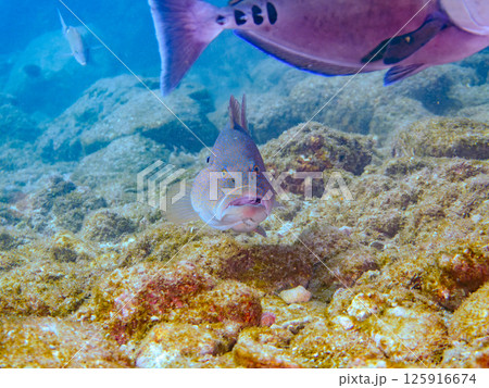 美しいホウライヒメジ(ヒメジ科)、ニザダイ(ニザダイ科)、メジナ(イスズミ科)他の群れ。ヒリゾ浜。