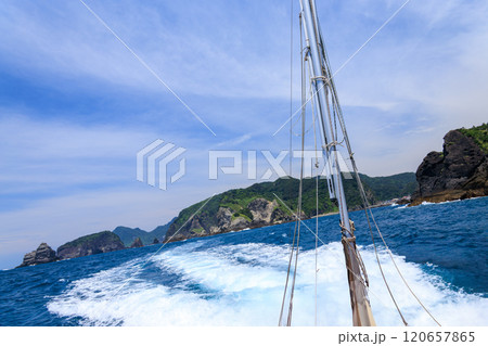ヒリゾ浜渡船に乗って出港するスキンダイバー、シュノーケラー。 青い海と無人島の大根島、岩礁が見える。