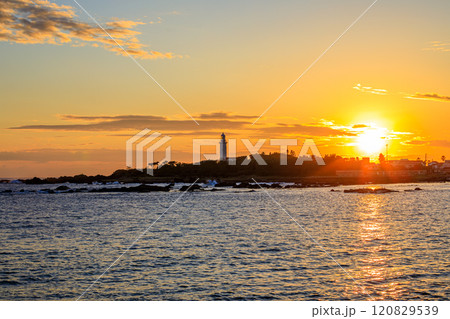 朝焼け空を背景にした南房総千倉町の荒磯に立つ小さな灯台風景の Ver1