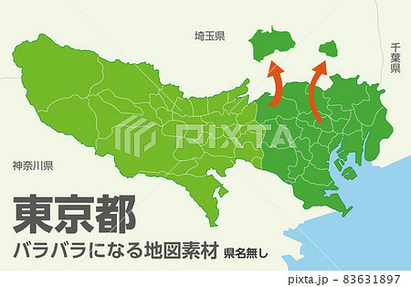 東京都の地図のイラストレーション。23区26市3町1村。各区市町村ごとバラバラになります。