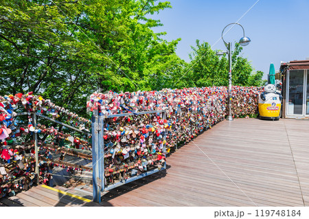 Love locks at N-Seoul Tower, Seoul, South Korea, symbolize forever love with inscribed messages