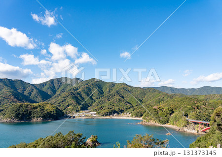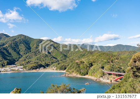 三重県南伊勢町 南島大橋の見える中ノ磯展望台からの秋の贄湾と慥柄の漁村の眺め