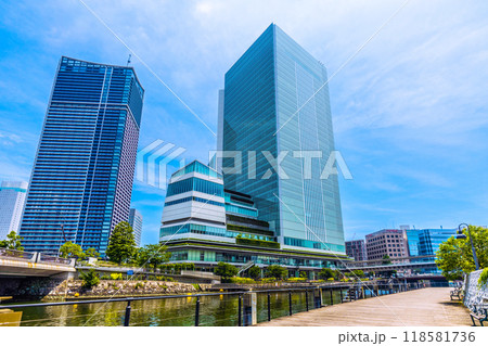 日本の横浜都市景観 桜木町駅前から夏空が広がる横浜ランドマークタワーなど、みなとみらいの街を望む