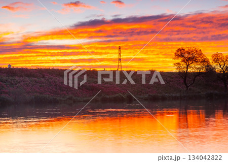 岐阜県海津市南濃町津屋 曼殊沙華(彼岸花)が土手一面に咲く津屋川堤防の朝焼け空と水面の反射