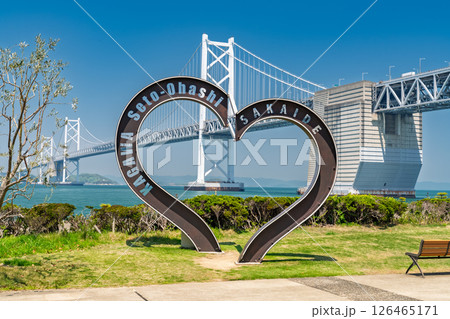 香川県坂出市 坂出市側から見る晴天の瀬戸大橋と瀬戸大橋タワー
