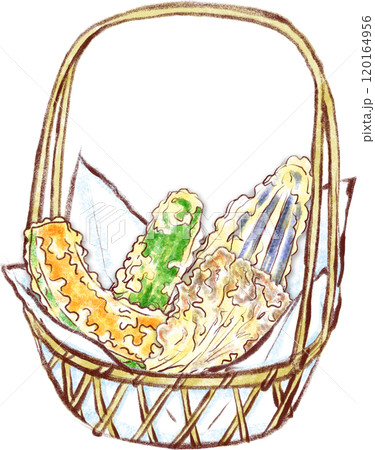 天ぷらのイラスト_天ぷらかごに入った野菜天四種盛り