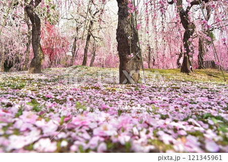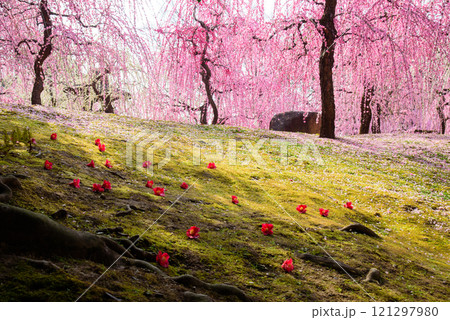 城南宮の神苑、落椿と梅の花美しい春の風景