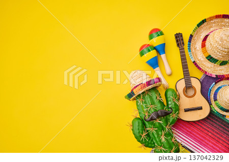 Mexican fiesta background with cactus, sombrero, guitar, maracas