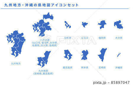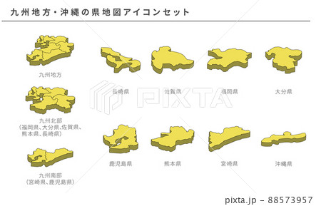日本地図、九州地方・沖縄の県地図アイコンセット、ベクター素材
