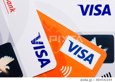 Close-up of Visa plastic credit payment cards with contactless pay symbol top view