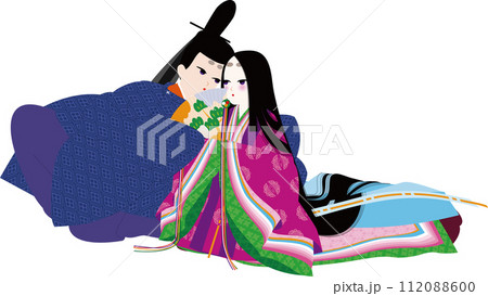 線画の「平安」王朝風。「几帳」のある男女のイラスト。日本の民族衣装「直衣」の男性と「十二単衣」の女性