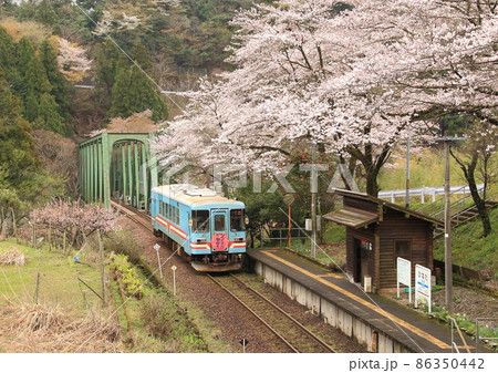 ローカル線の樽見鉄道停車駅横に咲く満開の桜とディーゼルカー