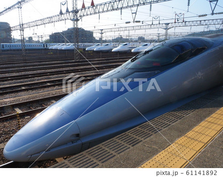 早朝の博多駅から東へと向かう新幹線500系電車(JR西日本)