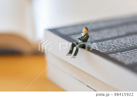 机の上に開いた英語の書籍 研究 学習 学び直しのイメージ 男性フィギア