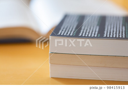 机の上に開いた英語の書籍とペン 研究 学習のイメージ