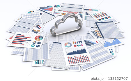 ビジネスデータをプリントした書類とクラウドアイコン、資料のデータ化やクラウド格納のイメージ