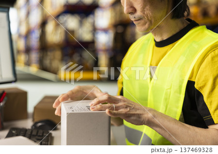 Logistics center employee manages packaging tasks and labeling, applying printed airway bill tracking number on packages. Man in hi vis vest packing orders in storage room depot.