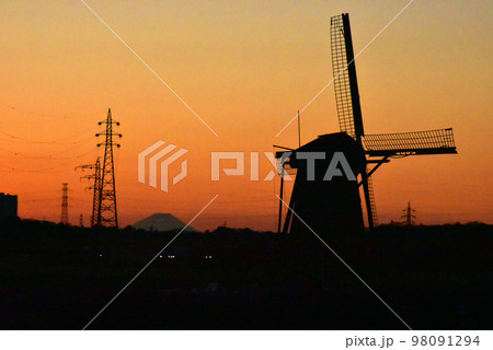【千葉県佐倉市】元旦の佐倉ふるさと広場 風車と夕日と富士山