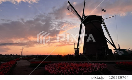 【千葉県佐倉市】夕暮れ 佐倉ふるさと広場 チューリップ畑の風車