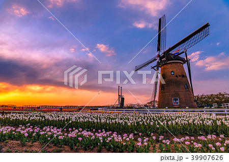 【田園風景】チューリップ畑とオランダ風車【佐倉】
