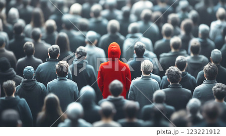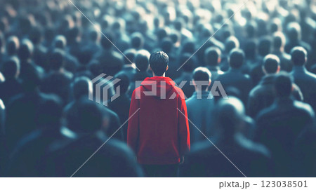 群衆の中で際立つ唯一無二の存在を表現した抽象的な青い人型シンボル