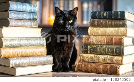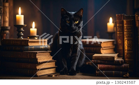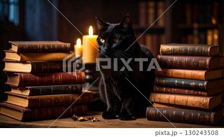 古書とロウソクに囲まれた黒猫の神秘的な姿