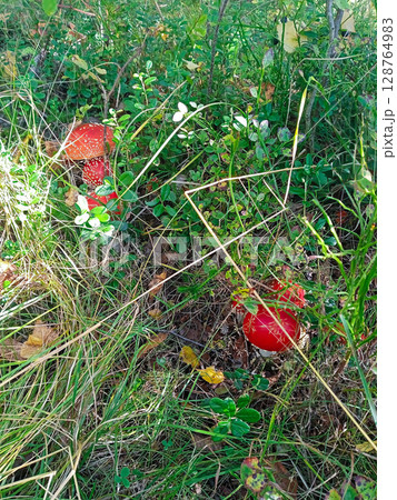 Autumn background. amanita muscaria mushroom in autumn forest. harvest fungi concept. Fly agaric, wild poisonous red mushroom in yellow-orange fallen leaves