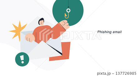 Flat style illustration of a person coming out of email envelope reaching a fish hook with exclamation warning sign, representing phishing email, cyber attack and online scam concept.