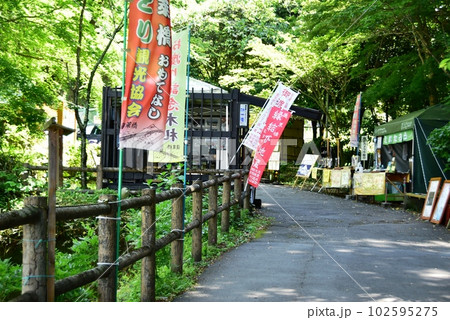 島田市 蓬莱橋南岸の散策路とショップと新緑