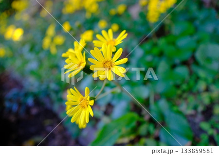 黄色い花、黄色い石蕗の花、黄色いツワブキの花、森の中の石蕗の花
