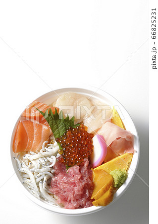 俯瞰で撮影したサーモン、シラス、いくら、帆立、まぐろがのった彩り鮮やかな海鮮丼(白背景)