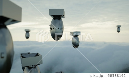 Falling bombs against the dark sky. Atom bomb. 3d rendering