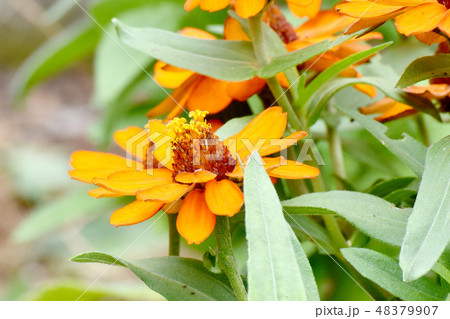 三鷹中原に咲くオレンジのヒャクニチソウ(ジニア)の花