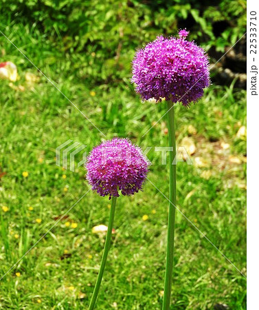 紫色のボール状の花でアリウム・ギガンチウムという名前。葱に似ていることから別名花葱というらしい。