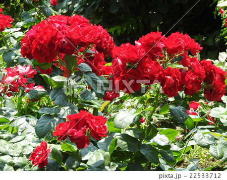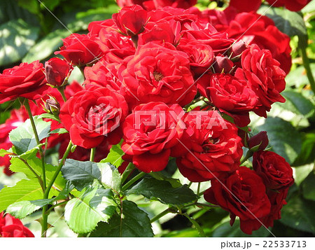 野ばらの特徴である房咲き性がある薔薇。耐寒性に優れ、真紅の花が房になって咲く姿は圧巻である。