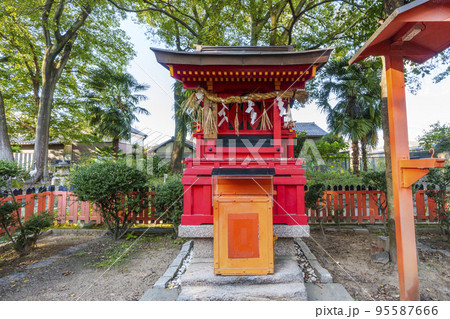 日本の東京都市景観 東京・秋葉原の柳森神社(通称=倉稲魂大社)。狐や狸…、摂社・末社…=神田須田町
