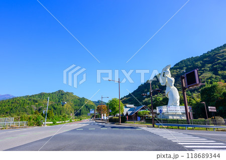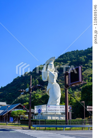 秋晴れ光芒に映える厳木町の名物巨大像「佐用姫像」 道の駅厳木 「風のふるさと館」(佐賀県唐津市)
