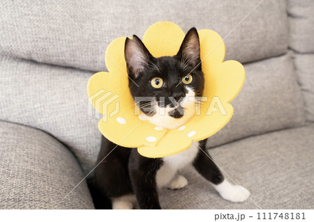 黄色いエリザベスカラーをつけた黒い仔猫