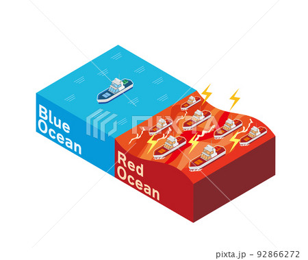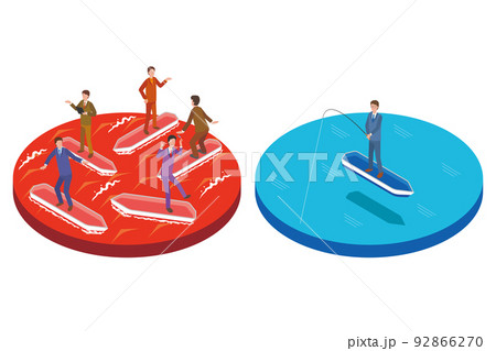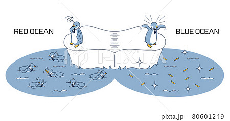 レッドオーシャンかブルーオーシャンに飛び込んで餌を獲ろうか迷うペンギンのアイソメイラスト