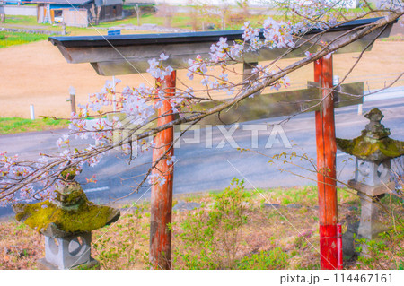 山梨県南アルプス市中野 隠れた桜の名所諏訪神社の鳥居と境内の満開の桜