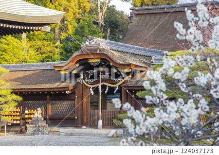 京都 梅宮大社 満開の梅と拝殿・本殿