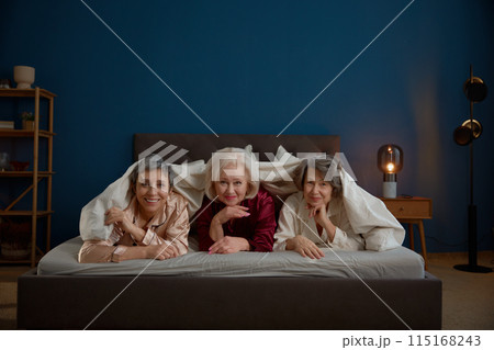 Funky aged woman friends relaxing together at home bedroom