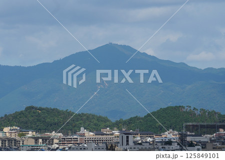 嵐山の寺院の展望台から見た双ヶ丘と比叡山