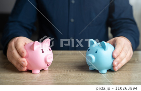 Two piggy banks symbolizing opposite genders. Property rights in case of marriage and divorce of spouses. Shared budget for spending. The credit history of both partners when applying for a mortgage.