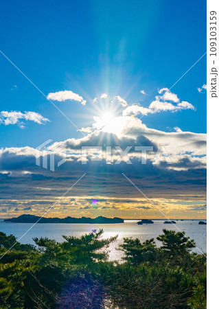 日本三景 松島 双観山から眺める松島湾 日の出 ご来光 朝の景色 宮城県松島町
