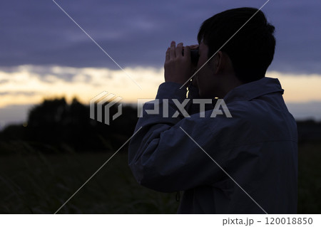 バードウォッチングをする若い女性 トレッキングイメージ