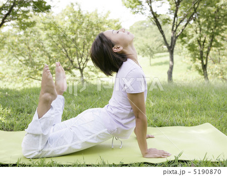 ヨガ、コブラのポーズ、マッケンジー体操、背中を反る女性